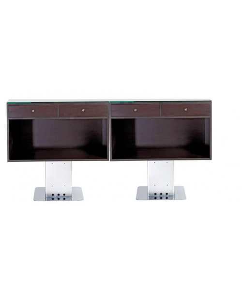 Рецепция прямоугольной формы, выполнена из ламината цвета венге или белого цвета, с четырьмя выдвижными ящиками, на двух металлических ножках. Фасад выполнен из стекла. Возможен вариант с подсветкой.