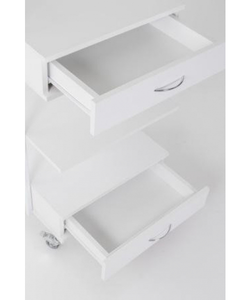 Столик для профессионального использования на металлическом каркасе белого цвета с одной полкой из ЛДСП, двумя выдвижными ящиками и специальным креплением для лампы-лупы. Столик оснащен колесиками, благодаря которым его легко можно передвигать и ваши инструменты всегда будут под рукой. Идеально подойдет для педикюрного, косметологиче- ского и массажного кабинетов.