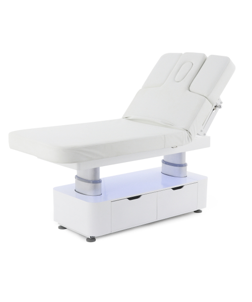 Стол изготовлен с учётом всех потребностей современной индустрии красоты. Мягкое и комфортное ложе имеет несколько секций и 4 мотора для плавной регулировки высоты и угла наклона подвижных частей. Рама изделия выполнена из стали высокой прочности и выдерживает нагрузку до 150 кг, что гарантирует долгий срок службы оборудования.